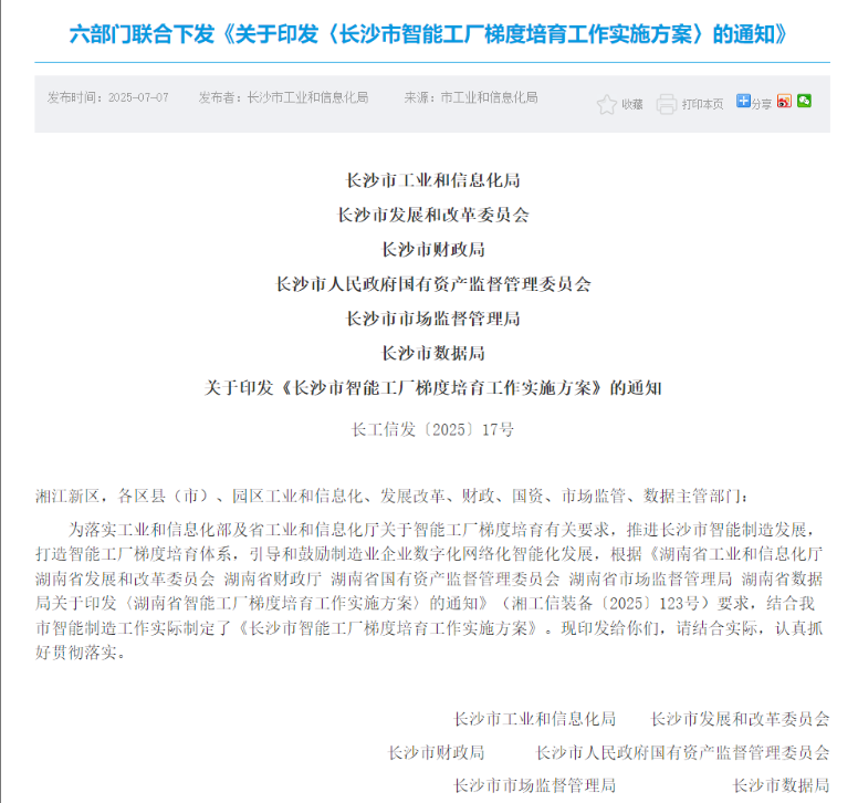 近日,為落實(shí)工業(yè)和信息化部及省工業(yè)和信息化廳關(guān)于智能工廠梯度培育有關(guān)要求,推進(jìn)長(zhǎng)沙市智能制造發(fā)展,打造智能工廠梯度培育體系,引導(dǎo)和鼓勵(lì)制造業(yè)企業(yè)數(shù)字化網(wǎng)絡(luò)化智能化發(fā)展,根據(jù)《湖南省工業(yè)和信息化廳 湖南省發(fā)展和改革委員會(huì) 湖南省財(cái)政廳 湖南省國(guó)有資產(chǎn)監(jiān)督管理委員會(huì) 湖南省市場(chǎng)監(jiān)督管理局 湖南省數(shù)據(jù)局關(guān)于印發(fā)〈湖南省智能工廠梯度培育工作實(shí)施方案〉的通知》要求,長(zhǎng)沙市正式出臺(tái)了《長(zhǎng)沙市智能工廠梯度培育工作實(shí)施方案》。