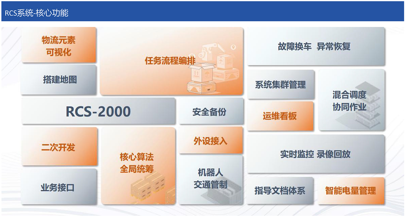 RCS移動機器人控制系統是對廠內物流機器人進行任務分配、AGV車輛調度、路徑規劃等的集中控制系統。對外,RCS系統作為訂單系統的下游系統,承接訂單的處理。對內,RCS系統與環境內的門禁、電梯等設備進行通信交互,完成全場交通自動化。最后,RCS系統提供完整的機器人隊列異常監控管理、執行效率統計等功能,對廠內物流完成統一管理。